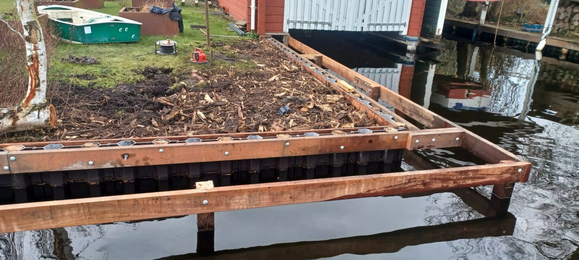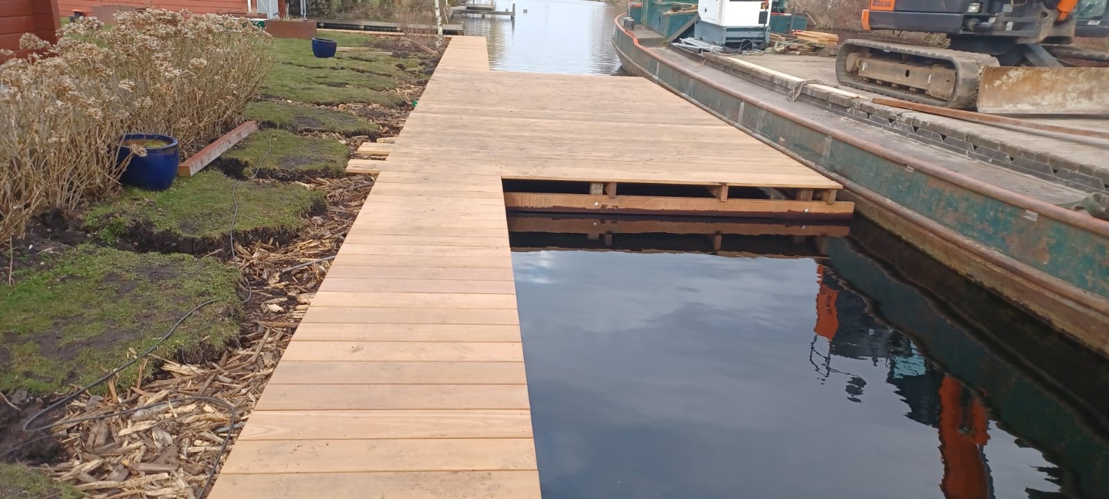 Bovendien hebben wij de beschikking over een loswal voor het laden/lossen van vrachten: grond, grind, stenen, zand en snippers. Daarnaast kunnen wij vanaf daar uw chalet, caravan, tuinhuis en/of eventuele bouwmaterialen vervoeren naar uw locatie, tevens beschikken wij over een betonmixer met een inhoud van 6 m3, waarmee wij vanuit de boot het werk kunnen storten.